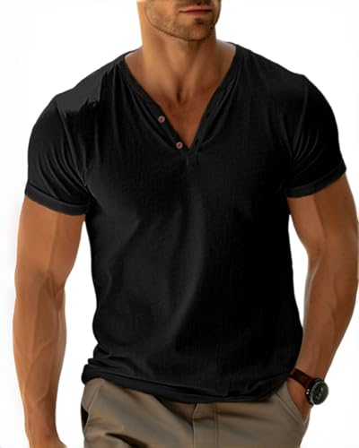 Hommes Coupe Slim Manche Short Henley T-Shirt...